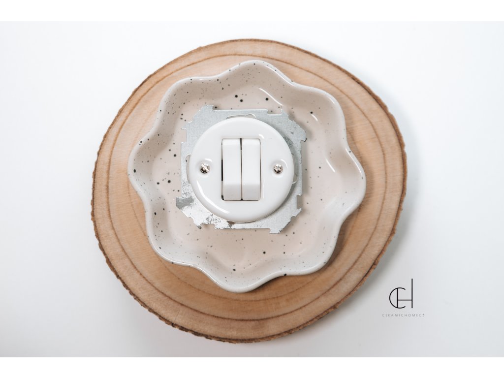 Kolébkový vypínač č.6/6 bez rámečku. Nejen vypínač ale i designový doplněk do každého interiéru, který díky svému kulatému provedení a luxusní bílé barvě zaručeně rozsvítí Váš domov. Jednoduché linie keramického vypínače zaujmou každého na první pohled. Vypínač je určený pro vnitřní použití a pasuje do klasických elektroinstalačních krabic KU 68.